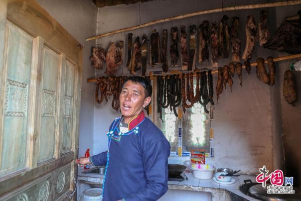 為慶祝剛過完的彝族新年,吉好也求一家做了很多臘肉,他打開廚房門向記者展示自家做的兩大排臘肉。中國網(wǎng)記者 劉楨珂 攝