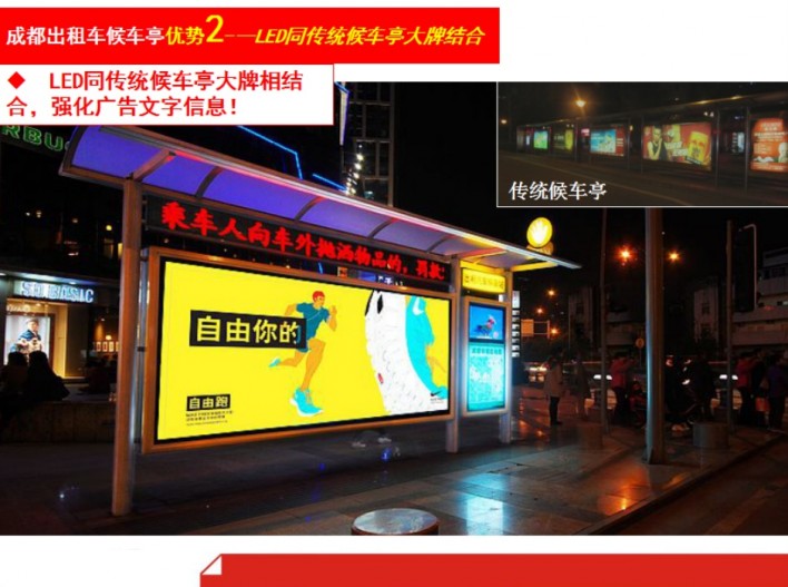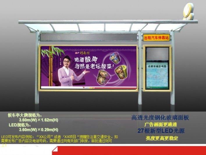 成都出租車停靠站候車亭燈箱廣告位可以當(dāng)做成都公交車站臺候車亭燈箱廣告位來使用,費(fèi)用還要比成都公交候車亭燈箱廣告位低一點(diǎn)。