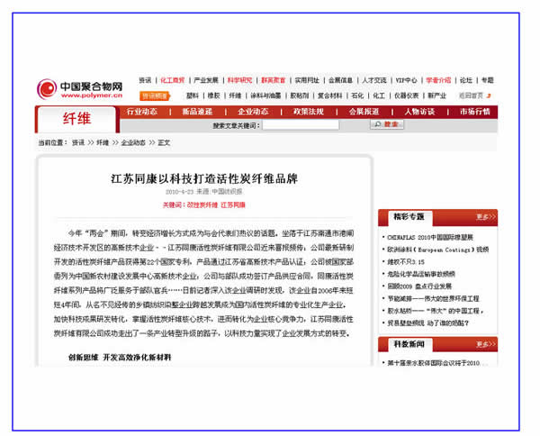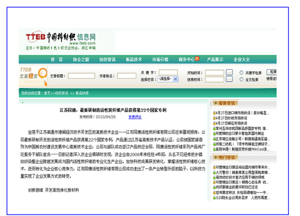 中國棉紡織信息網(wǎng)、中國聚合物網(wǎng)——江蘇同康:最新研制的活性碳纖維產(chǎn)品獲得第22個國家專利