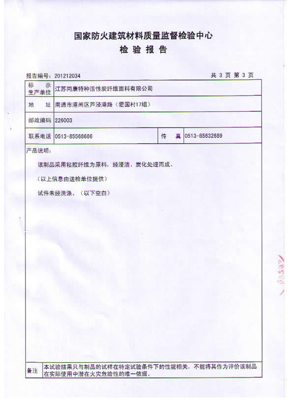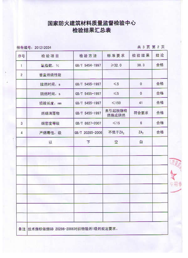 按國家標準GB 20286-2006《公共場所阻燃制品及組件燃燒性能要求和標識》判定,我公司研制的粘膠基炭化防火面料燃燒性能符合織物阻燃1級的規定要求,燃燒性能達到阻燃1級。該炭化防火面料由粘膠纖維織物為原料,經浸漬,炭化處理而成,具有耐高溫、耐明火,無陰燃,無續燃,無毒無害的特點,具有永久性阻燃功能。